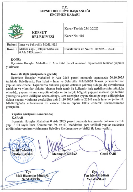HOTAŞLAR MAHALLESİ 2863 PARSEL YIKIM KARARI İLANI